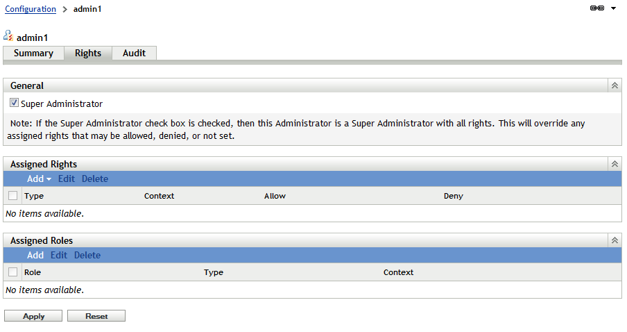 NOTE:You do not configure the contexts to which the rights apply until you assign the role to an administrator or administrator group. This allows you to use the same role for administrators requiring the role in different contexts. For information about assigning roles, see Section 5.2, Assigning Roles.