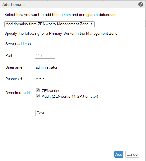 Choose Add domains from ZENworks Management Zone, then specify the following: