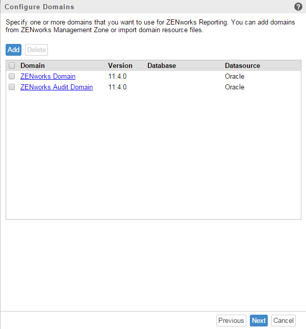 Specify one or more domains that you want to use for ZENworks Reporting. You can add domains from ZENworks Management Zone or import domain resource files.