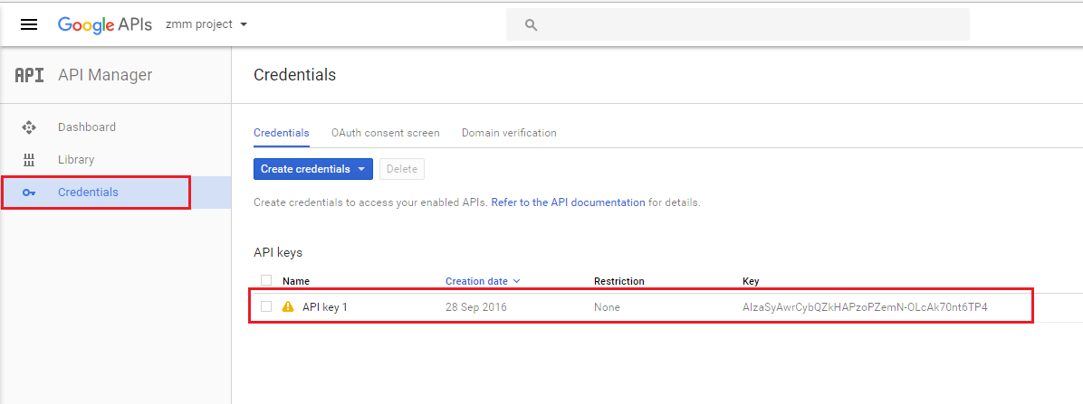 On the API Manager page, click Credentials to view the API key.