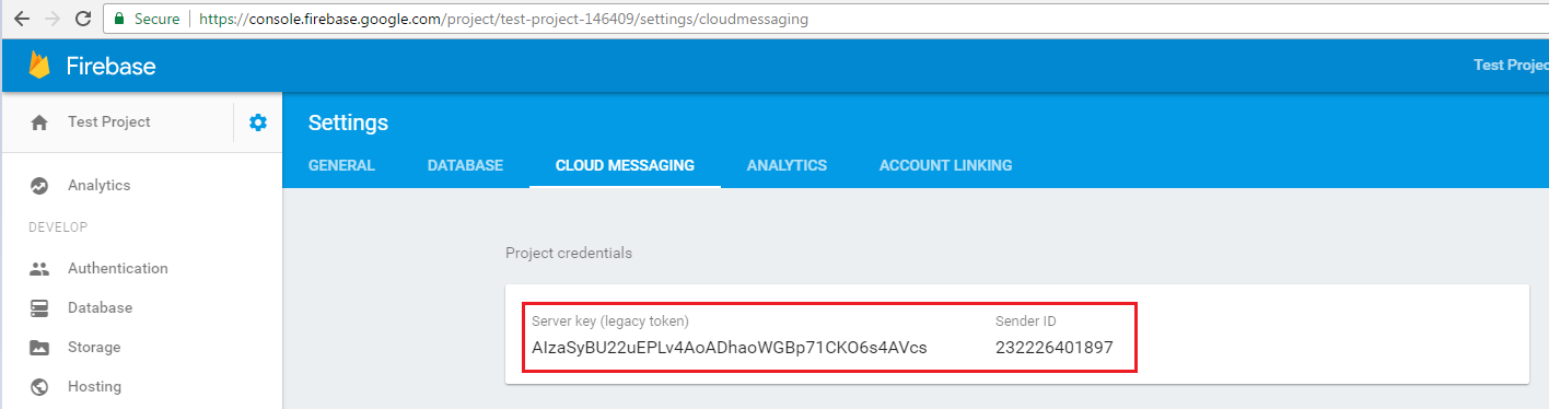 Select the Cloud Messaging tab. You can now view the Server Key, which is the same as the API key, and the Sender ID, which is the same as the Project Number.
