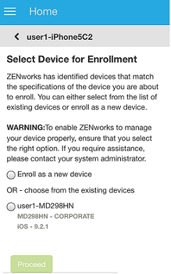 In such a scenario, enable Allow Manual Reconciliation by User in the Mobile Enrollment Policy. When the user re-visits the ZENworks User Portal page to complete ActiveSync Only enrollment of the unretired device (see Enrolling an Email Only Device) and after selecting the device ownership type, the ZENworks User Portal will list all active iOS devices associated with the user that are enrolled to the ZENworks Management Zone. The user can select the appropriate device to manually reconcile the device to the existing device object. The user also has the option to select Enroll as New Device. Click Proceed.