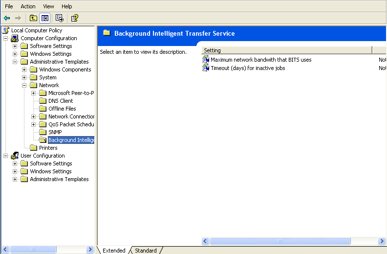 Expand the console tree to display the BITS setting (Local Computer Policy > Computer Configuration > Administrative Templates > Network > Background Intelligent Transfer Service).