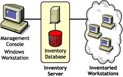 Management console: A Windows workstation or server running Novell ConsoleOne with Desktop Management Workstation Inventory ConsoleOne snap-ins installed. The management console provides the interface to administer the inventory system.