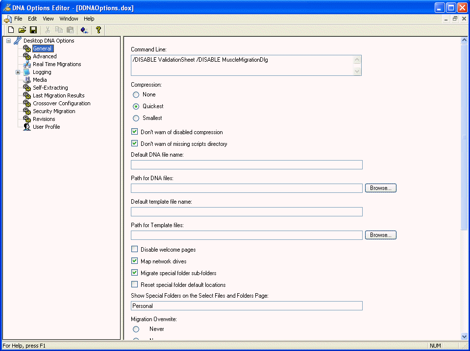 Navigate to c:\program files\novell\zenworks\personality migration and open the DDNAOptions.dox file, then click in the left pane of the Options Editor window.