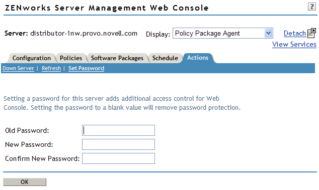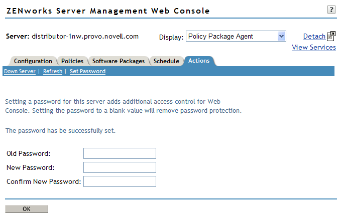 On any Remote Web Console page, click Detach in the upper right corner to display the current page in a new browser window. This enables you to access multiple Remote Web Console features at the same time. For example, you could detach one window for the Tiered Electronic Distribution agents and another window for the Policy/Package Agent. Or you could detach a window for the Remote Web Console and still be able to perform other ZENworks Server Management tasks in the main Novell iManager window.