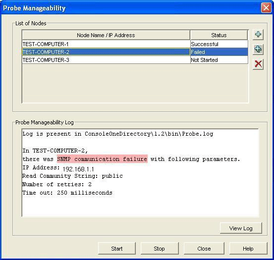 Figure 27-3 Probe Manageability Log with details of SNMP failure.