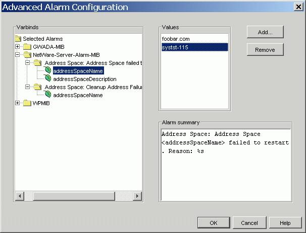 In Advanced Alarm Configuration dialog box, expand the tree until you see the varbinds of a selected alarm.