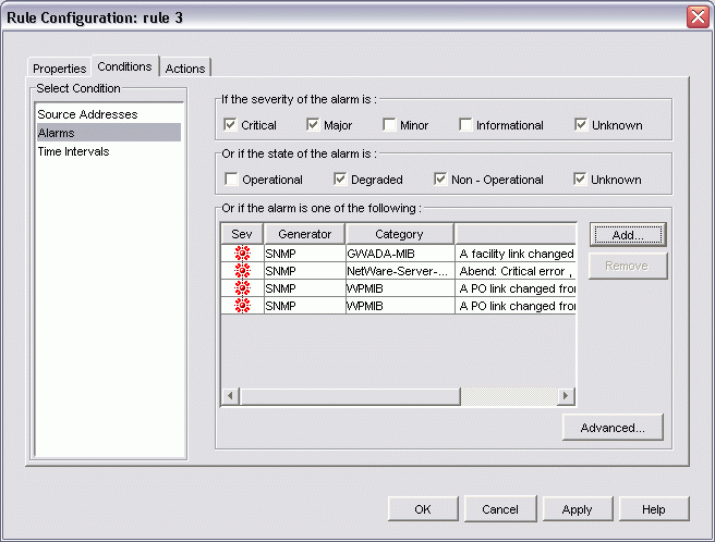 The Conditions page of Rule Configuration page includes other configurations that filters alarms based on their severity, state, and ID. You can select one or more levels of severity, including Critical, Minor, Major, Informational, and Unknown. You can also select one or more state, including Operational, Degraded and Non-Operational. For example, if you select the severity as Critical and the state as Degraded, then you get alarms only if they are of Critical severity with the state as Degraded.