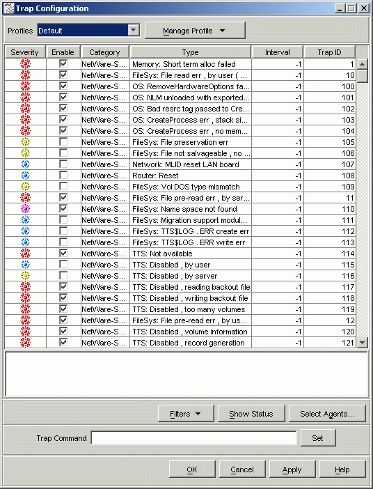 The nwtrpagt.nlm and dstrpagt.nlm agents implement a table for all the NetWare Server Alarm MIB Traps and Novell Directory Services MIB Traps. These tables are defined by NWTRAPCONFIGURATION MIB and NDSTRAPCONFIGURATION MIB. Each row in this table has an editable fields for Trap Status and Intervals. The number of rows are same as the number of Traps defined in NetWare Server Alarm MIB and Novell Directory Services MIB.