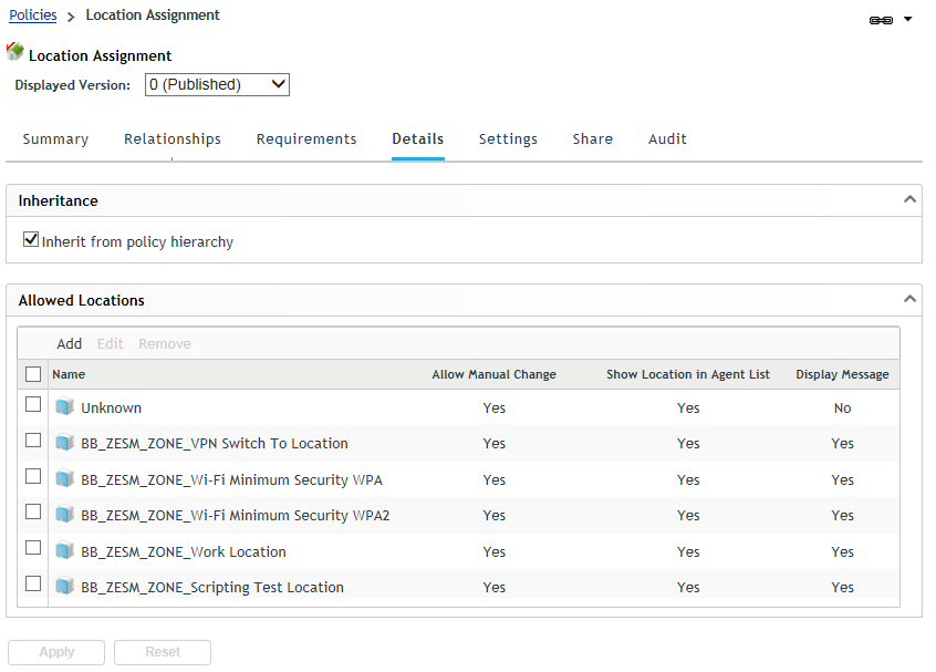 There are six locations included in the policy: the standard Unknown location and five locations that start with BB_ZESM_ZONE. The BB_ZESM_ZONE locations were imported with the policy and added as locations in your zone. If you go to the Locations page (Configuration > Locations), you will see them listed.