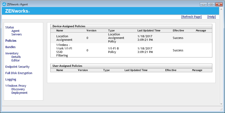 When the device finishes refreshing, right-click the ZENworks icon, and select Technical Application to display the ZENworks Agent, then click Policies and make sure the Location Assignment, Wireless - Minimum Wi-Fi Security WPA, and Wireless - Minimum Wi-Fi Security WPA2 policies were successfully applied.