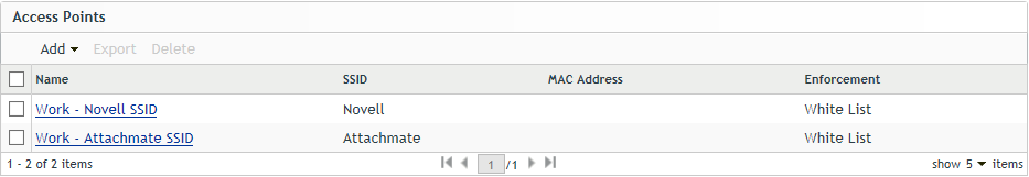 The Access Points list is used to explicitly approve (whitelist) or prohibit (blacklist) Access Point SSIDs. If the list doesn’t include any Access Points, all Access Points are approved. As soon as one Access Point is added, the list becomes an explicit list and only explicitly approved Access Points are allowed.