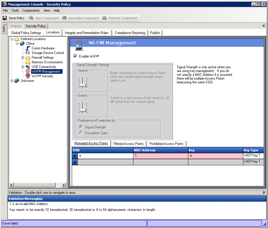 When the administrator attempts to save a policy with incomplete or incorrect data in a component, the Validation pane will display at the bottom of the Management console, highlighting each error. The errors MUST be corrected before the policy can be saved.