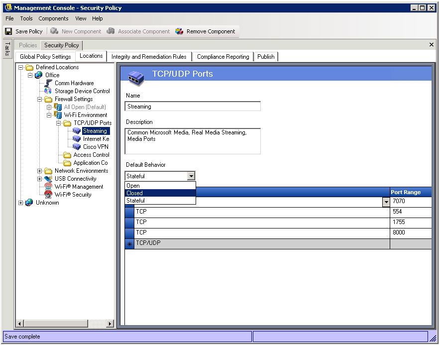 Example: The default behavior for all ports is set as All Stateful. The ports lists for Streaming Media and Web Browsing are added to the firewall setting. The Streaming Media port behavior is set as Closed, and the Web Browsing port behavior is set as Open. Network traffic through TCP Ports 7070, 554, 1755, and 8000 would be blocked. Network traffic through ports 80 and 443 would be open and visible on the network. All other ports would operate in Stateful mode, requiring the traffic through them be solicited first.