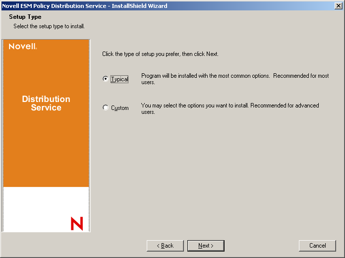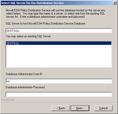 A typical installation places the Policy Distribution Service software files in the default directory: \Program Files\Novell\ESM Policy Distribution Service. The SQL database name is assigned as STDSDB. The three SQL database files (data, index, and log) are placed in: \Program Files\Microsoft SQL Server\mssql\Data.
