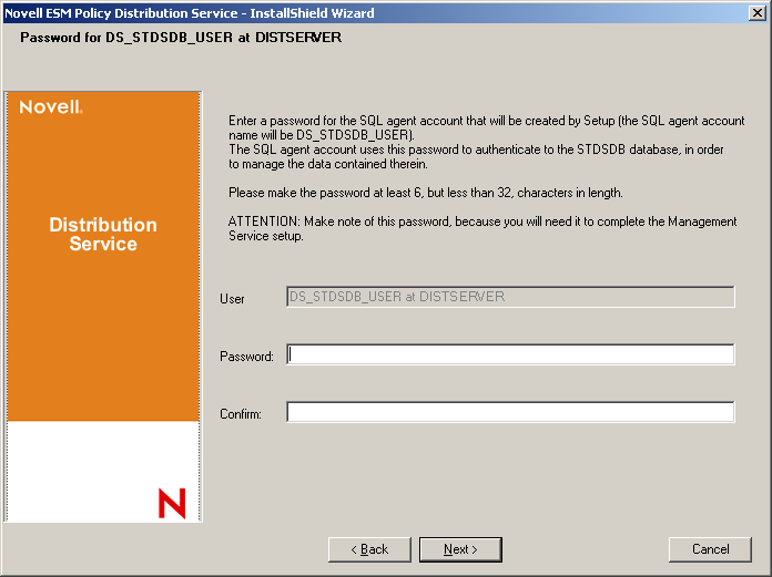 Specify the password for the Policy Distribution Service agent. This is the username and password the service uses to log in to its SQL database.