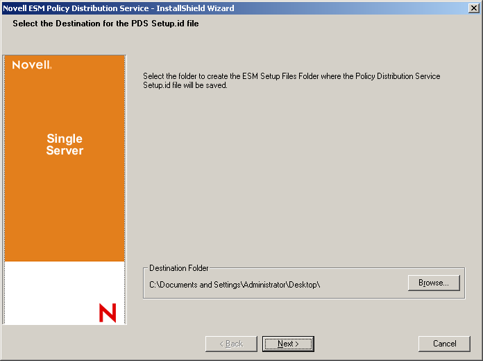 An ESM Setup Files folder is generated in the installation directory. This contains a Setup ID file and the ESM-DS.cer file (Novell self-signing SSL certificate, if selected) required by the Management Service. Use Browse to designate where this file should be saved on the server (default = installation directory).