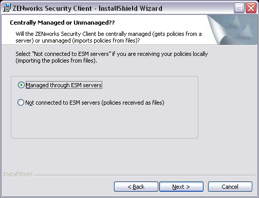 Figure 10-1 Select “Not Connected to ZENworks Endpoint Security Management Servers”