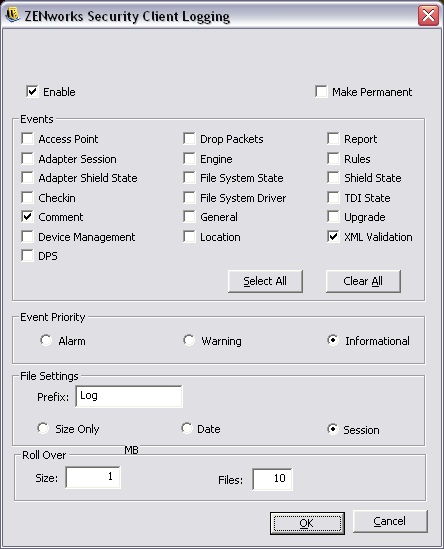 Logging can be turned on for the Endpoint Security Client, permitting it to log specific system events. The default logs gathered by the Endpoint Security Client are XML Validation and Commenting. Additional logs can be selected from the checklist. When troubleshooting, you should set logging according to the directions of Novell Support and repeat the circumstances that led to the error.