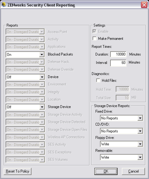 Reporting allows the addition of reports for this endpoint. Reports can be added and increased in duration; however, reports cannot fall below what was already assigned by the policy (for example, specific reporting, if activated in the policy, cannot be turned off). See Section 13.0, Configuring a Policy’s Compliance Reporting for descriptions of the report types.