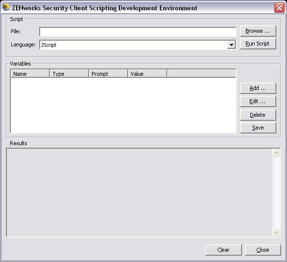 The button allows the administrator to enter a specific script into the Security Client. The script runs only on this endpoint. You can use the scripting window to browse for an available script (scripts must be either JScript or VBScript), or a script can be created by using this tool.