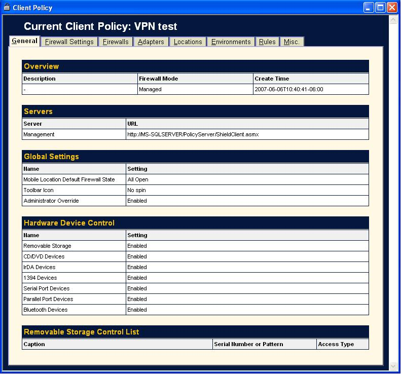 Policy: Captures the current policy running on the Endpoint Security Client (see View Policy).