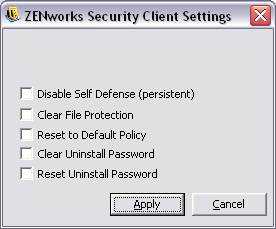 Disables all protections used to keep the client installed and active on the machine. Disabling should only be used when performing patch fixes to the Endpoint Security Client.
