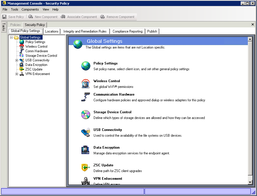 A security policy consists of global settings, location-specific settings, integrity rules, and compliance reporting settings: