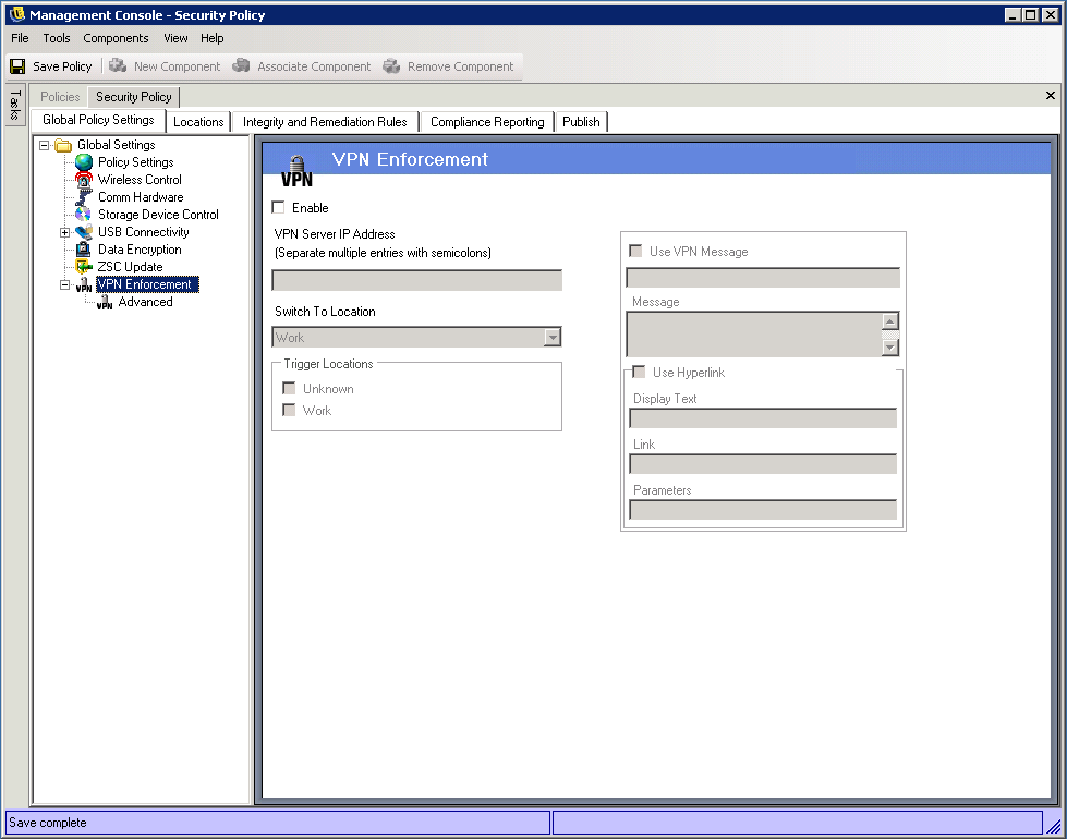 The VPN Enforcement settings enforce the use of either an SSL or a client-based VPN. VPN enforcement is typically applied at wireless hotspots, allowing the user to associate and connect to the public network, at which time the VPN connection is attempted and the user switched to a defined location and firewall setting. All parameters are at the discretion of the administrator. All parameters override existing policy settings. The VPN-Enforcement component requires the user to be connected to a network prior to launching.