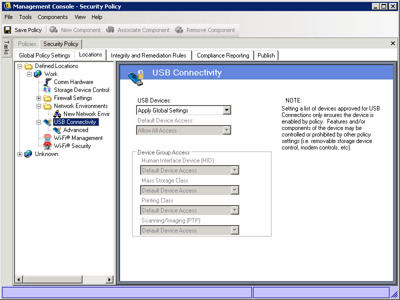 The USB Connectivity settings are also available as global policy settings (see Section 10.6, USB Connectivity). The location settings override the global settings.