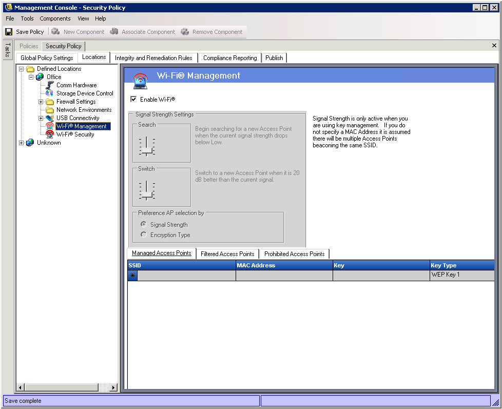 When more than one WEP-managed access point is defined in the list, the signal strength switching for the Wi-Fi adapter can be set. The signal strength thresholds can be adjusted by location to determine when the Security Client searches for, discards, and switches to another access point defined in the list.