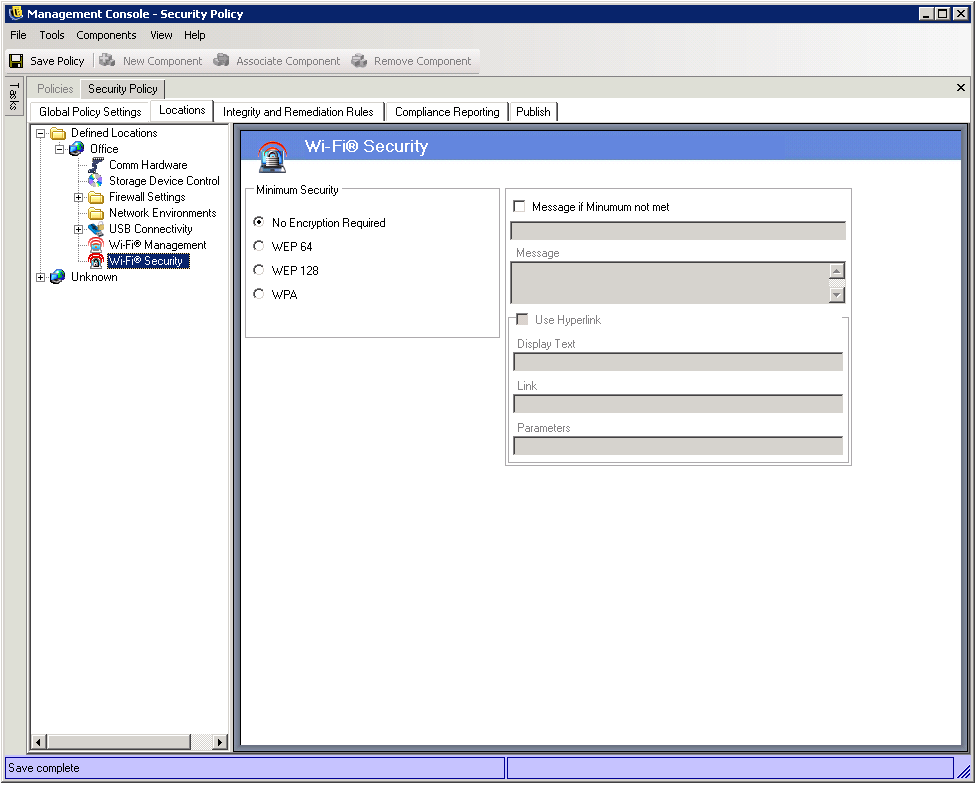 The Wi-Fi Security settings let you specify the minimum encryption that an access point must provide in order for the Security Client to allow a connection to the access point. Access points that do not meet the minimum security requirement are not displayed. If a user tries to manually define a connection to the access point, the connection is blocked.
