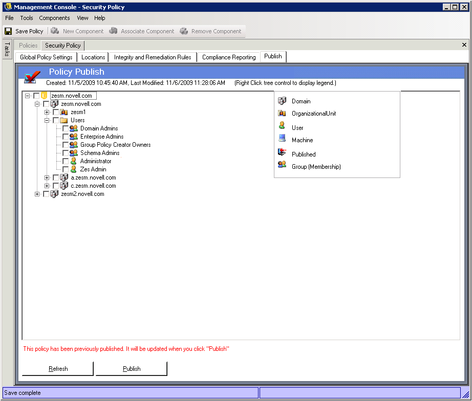 The Policy Publish page displays the directory service trees to which the system has connections.