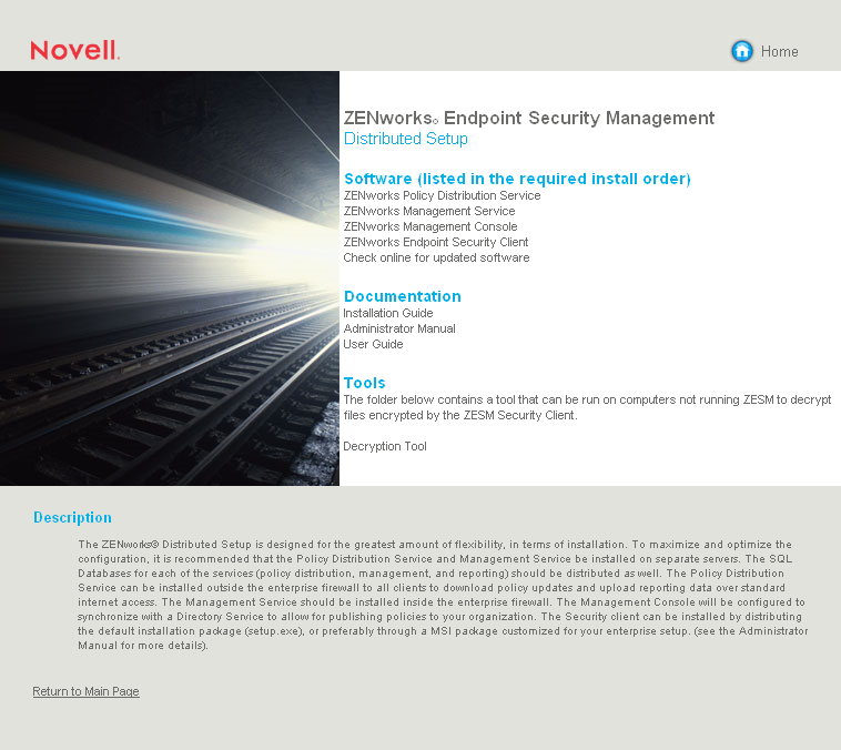 The Master Installer is a set of browser-based screens that helps you launch the setup programs for the various ZENworks Endpoint Security Management components.