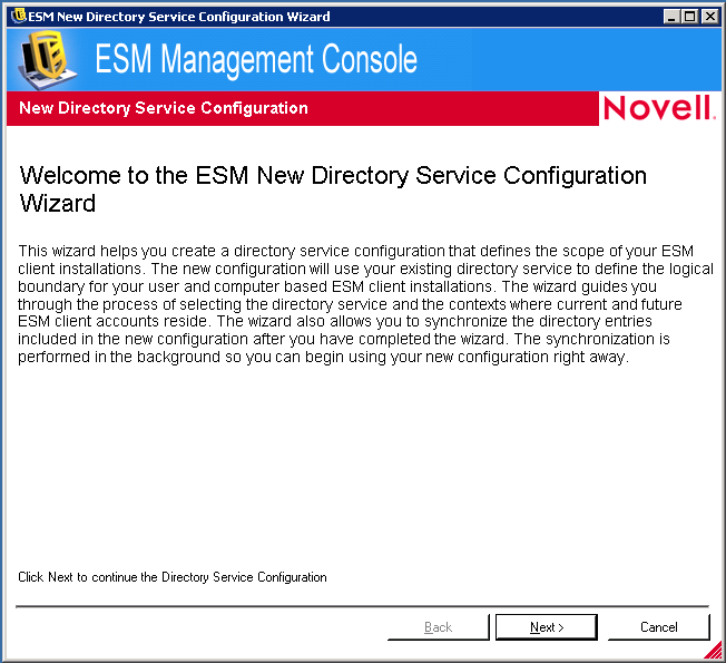 The Management Console starts with the New Directory Service Configuration Wizard displayed. The wizard lets you set up the connection to your directory service and specify the users and computers you want to manage with ZENworks Endpoint Security Management.