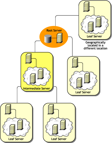 In this configuration, the Leaf Servers roll up data to the next-level Intermediate Server and finally to the Root Server. Another Inventory server, at a different location, is also connected to the Root Server.