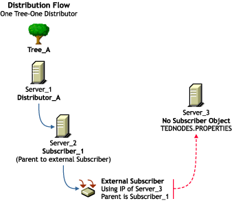 Because there is no Subscriber object for Server_3 in Tree_A, Server_3 will not receive any configuration information from the Distributor in Tree_A. Therefore, it must have the TEDNODES.PROPERTIES file installed on the server where configuration information is kept.