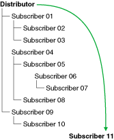 For example, your WAN has four LANs. With the Distributor in one LAN segment, it must send Distributions across three WAN links to get to Subscribers on the other three LAN segments. Let's assume each of the other LANs has 160 Subscribers who all need a Distribution from the Distributor. Without using parent Subscribers in the Distributor's routing hierarchy, the Distributor would have to send the Distribution 480 times across WAN links. In using parent Subscribers (four per LAN segment to share the Distribution workload on the LAN), the Distributor would only have to send the Distribution nine times.