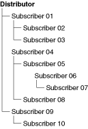 The following illustrates a Distribution hierarchy containing a Distributor, several parent Subscribers, and many end-node Subscribers: