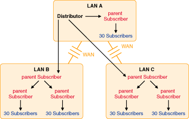 Because Distributors can send Distributions to parent Subscribers, which in turn can send them on to other Subscribers, a way is provided to send Distributions over a WAN link just once, instead of many times to reach every Subscriber on the other side of the WAN link.