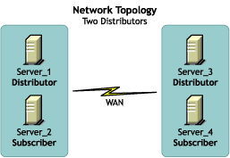 The following is an example of the physical network connections between Distributor and Subscriber servers in a WAN environment.