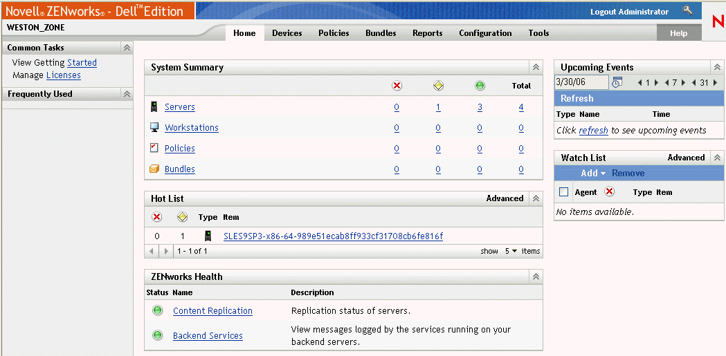 The ZENworks system is administered at the Management Zone level through the ZENworks Control Center, a task-based Web browser console.