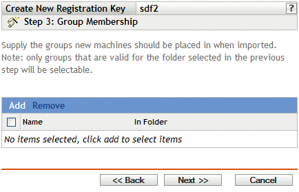 Click to add a group. You can only add groups that are valid for the type of device folder you specified on the previous page of the wizard. For example, if you specified the /Devices/Workstations folder, you can only choose workstation groups.