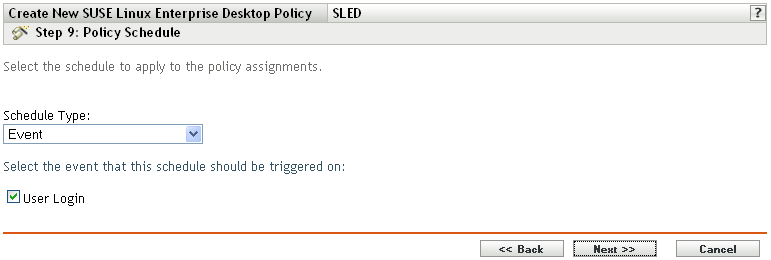 3. In the Policy Type list, click SUSE Linux Enterprise Desktop Policy, then click Next to display the Policy Name page.