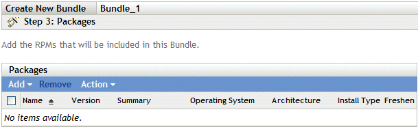 Use the Packages page to upload RPM packages to the bundle or to import RPM packages contained in the ZENworks Linux Management package repository. The packages that you upload to a bundle must already exist on the local device on which you are running the ZENworks Control Center. During the bundle-creation process, packages are copied to the ZENworks Server and placed in the package repository (/var/opt/novell/zenworks/pkg-repo).