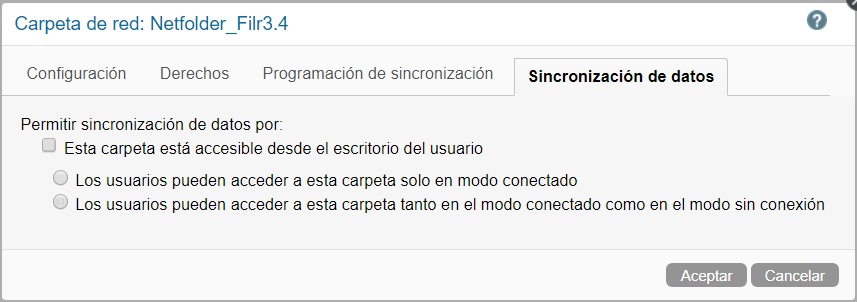 En la pestaña Sincronización de datos, deseleccione la opción Se puede acceder a esta carpeta desde el escritorio del usuario.