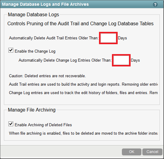 No ajuste las entradas de seguimiento de auditoría o registro de cambios indicadas en la captura de pantalla siguiente. Si lo hace, borrará más de lo que desea debido a un defecto de lógica existente en el código de Vibe 4.