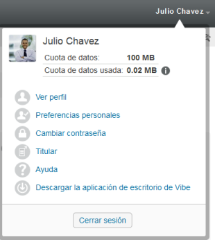 NOTA:si no puede modificar su información personal (como la contraseña de Vibe) de la forma descrita en esta sección, es probable que su información personal se esté sincronizando desde un servidor de directorio externo. Debe pedirle al administrador de Vibe que realice los cambios.