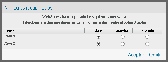 Haga clic en Omitir para conservar los mensajes guardados automáticamente pero no recuperarlos en WebAccess. La próxima vez que inicie WebAccess, se abrirá la ventana de almacenamiento automático.